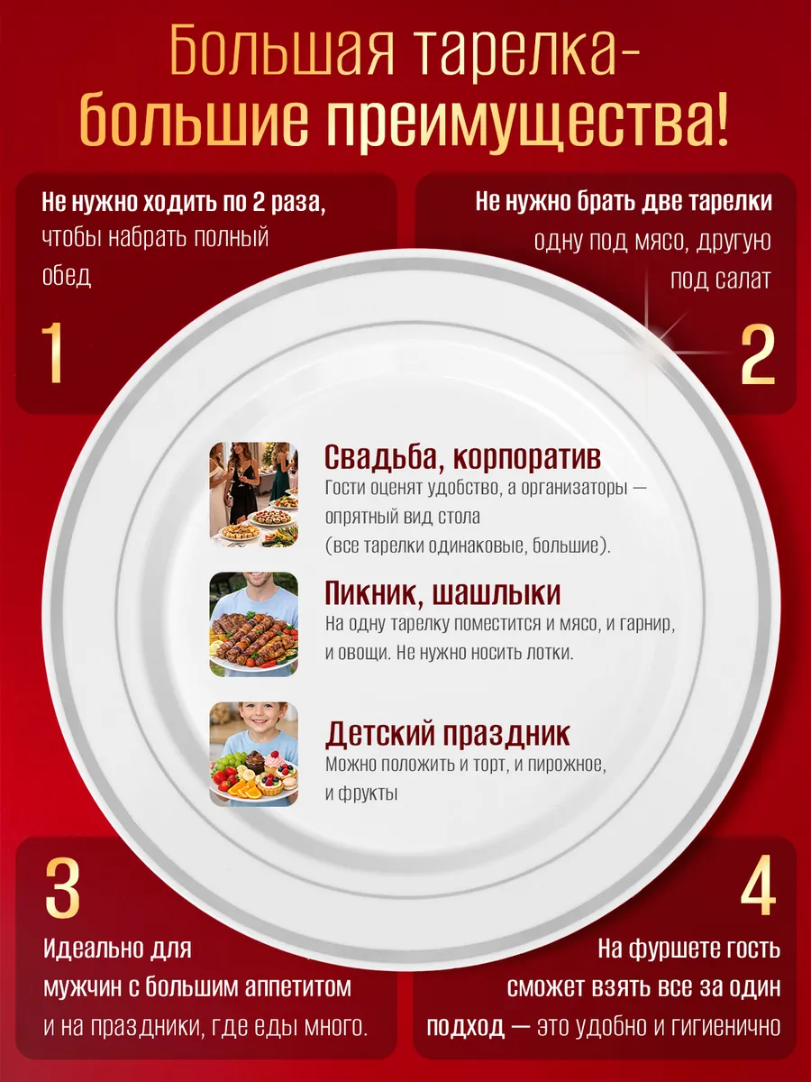 Праздничные мероприятия всегда требуют особого внимания к деталям, и набор одноразовых тарелок диаметром 26 см станет вашим незаменимым помощником в создании стильного и практичного оформления стола. Эти тарелки, представленные в комплекте из 10 штук, изготовлены из прочного полистирола, что делает их идеальными для сервировки как горячих, так и холодных блюд. Благодаря термостойкости, они не обжигают руки, что особенно важно при подаче горячих блюд. Эти одноразовые тарелки с изысканной металлизированной каймой добавят нотку элегантности вашему праздничному столу, будь то день рождения, юбилей или корпоративное мероприятие. Они гармонично впишутся в любой интерьер, создавая атмосферу уюта и праздника. Использование такой посуды позволяет не только украсить стол, но и значительно упростить процесс уборки после мероприятия, что делает их незаменимыми для фуршетов, банкетов и пикников на природе. Одноразовая посуда для праздника, такая как эти тарелки, идеально подходит для использования в кафе, ресторанах, на фуд-кортах и кейтерингах. Они также станут отличным решением для корпоративных обедов в офисах и школьных столовых. Благодаря своей прочности и стильному дизайну, эти тарелки можно использовать для сервировки супов, каш и десертов. Важно помнить, что одноразовая посуда не предназначена для использования в микроволновой печи и не должна контактировать с открытым огнем или агрессивными средами. Эти тарелки помогут вам создать незабываемую атмосферу праздника, добавив нотку элегантности и стиля в оформление вашего стола. Украсьте ваш праздник с помощью этих одноразовых тарелок и наслаждайтесь каждым моментом без лишних забот. Набор одноразовой посуды для праздника – это не только практичное, но и стильное решение для любого мероприятия. Пластиковая посуда, такая как эти тарелки, станет отличным выбором для тех, кто ценит удобство и эстетику в оформлении праздничного стола.