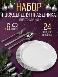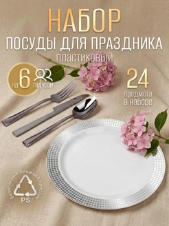 🎉 Организация свадьбы, пикника или дня рождения станет проще с набором одноразовой посуды на 6 персон! В комплекте 24 предмета: прочные тарелки (23 см), вилки, ножи и ложки. Белый пластик с серебристой каймой "Ромб" и элегантные приборы создают праздничную сервировку без хлопот.