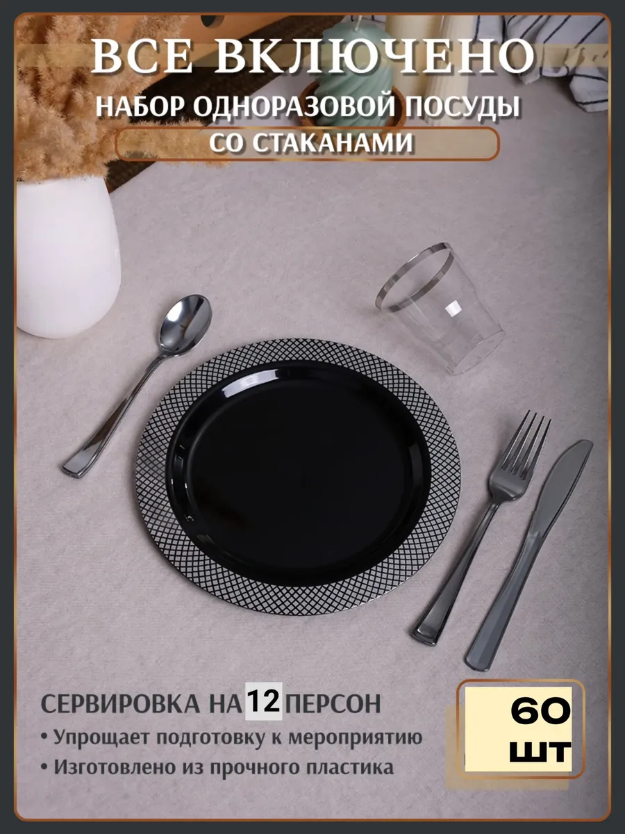 Набор пластиковой посуды для праздника на 12 персон. Комплект 60 предметов - Черные тарелки с рисунком Ромб, пластиковые стаканы и одноразовые серебристые приборы.