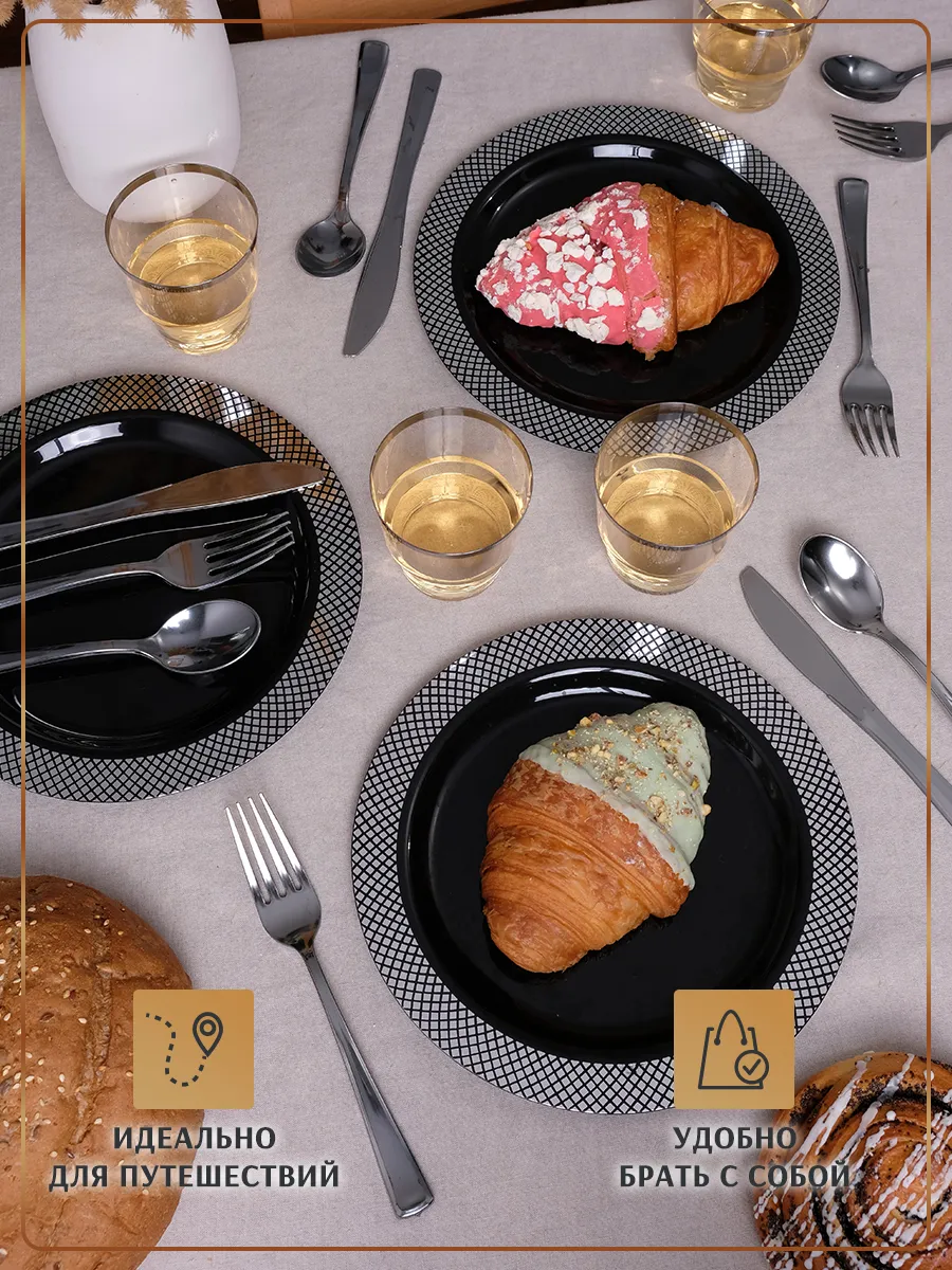 Набор разовой посуды для праздника на 12 персон можно использовать на природе, на даче, на вечеринке (хэллоуин, гендер пати, день рождения). Комплект пластмассовой посуды похож на фарфор, металлизированные приборы отлично выглядят при оформлении новогоднего стола. Комплект одноразовой посуды для праздника продуман до мелочей, не нужно тратить время на подбор подходящих друг к другу предметов. Дополните наш набор праздничной одноразовой посуды красивыми салфетками и Вы получите идеальную сервировку для вашего торжества на Новый год.