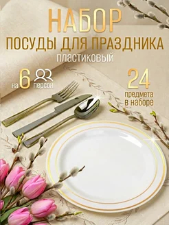 ✨ Стильный праздник без хлопот – набор одноразовой посуды на 6 персон в белом цвете с золотистой каймой и серебристыми приборами!