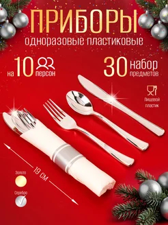 Набор включает 10 вилок (18,8 см), 10 ложек и 10 ножей (19,9 см). Приборы выполнены из качественного пластика — лёгкие, но прочные. Элегантные серебристые оттенки добавляют столу изысканности.