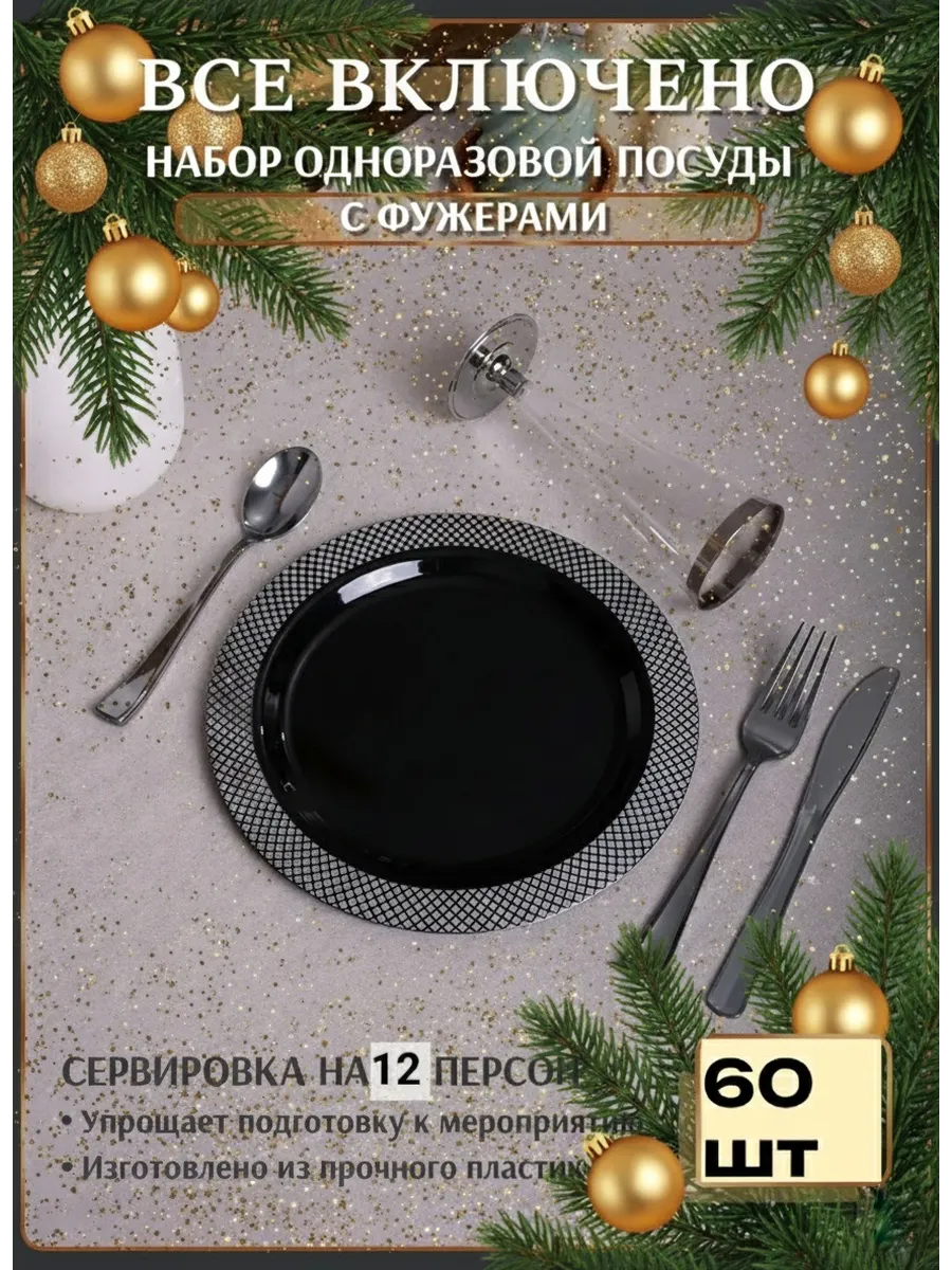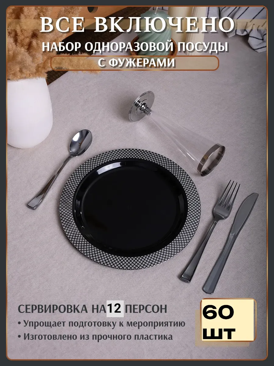Праздничный набор одноразовой посуды 60 предметов. В комплект входит одноразовая тарелка диаметром 23 см 12 шт, столовая ложка 18 см 12 шт, вилка пластиковая 19 см 12 штук, ножик 19 см 12 шт, фужеры на ножках 150 мл 12 шт. Цвет одноразовых приборов серебристый. Цвет пластиковых тарелок черный с серебристой каймой ромб.