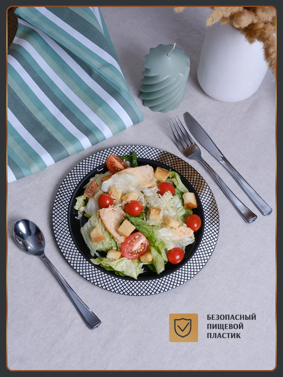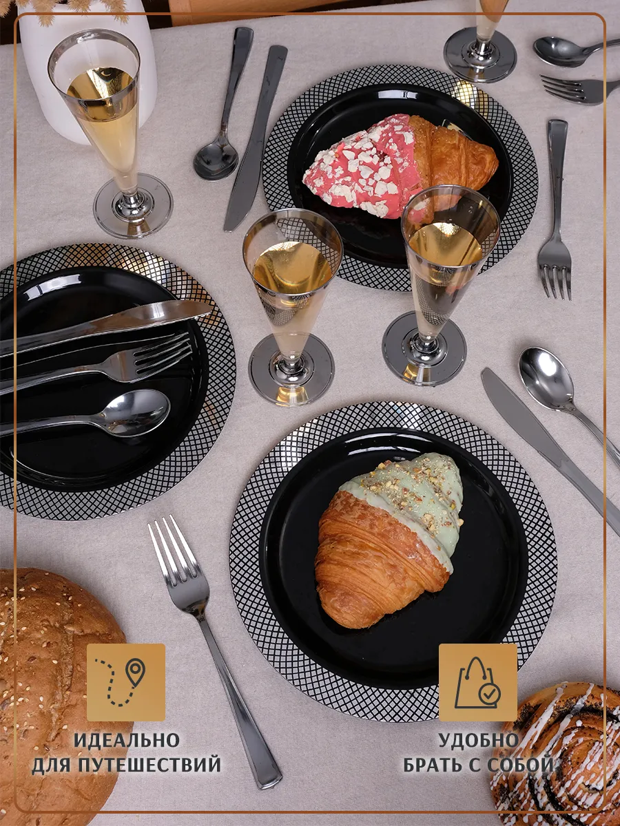 Набор включает тарелки диаметром 23 см каймой серебро ромбик, которые похожи на черный фарфор. Одноразовые столовые приборы: вилки, ложки, ножи серебристого цвета визуально неотличимы от металлических. Фужеры одноразовые для шампанского добавят нотку роскоши и станут украшением на вашем новогоднем столе.