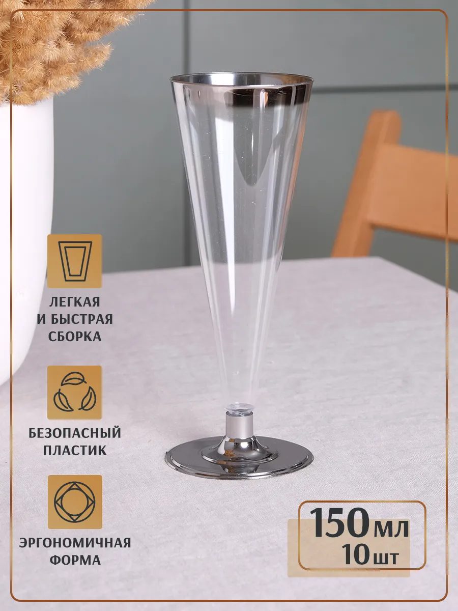 Набор одноразовой пластиковой посуды с металлизированными столовыми приборами и фужерами поможет вам красиво и стильно оформить праздничный стол! Вам не придется отдельно подбирать одноразовые вилки, ложки, ножи, тарелки, фужеры для шампанского, потому что вся пластиковая посуда в наборе гармонично сочетается между собой. Избавьте себя от мытья горы грязной посуды после застолья и не тратьте бесценное время на это.