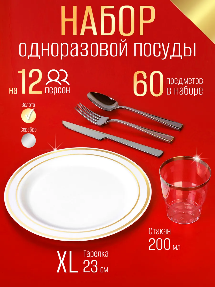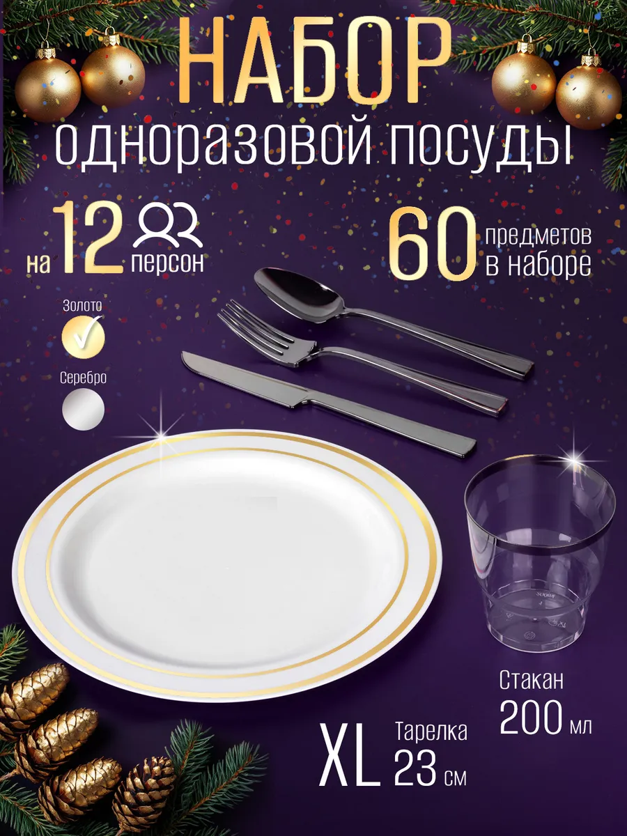 Набор одноразовой посуды для праздника на 12 персон станет вашим незаменимым помощником в организации свадьбы или пикника. В комплекте 60 предметов, включая одноразовые тарелки, пластиковые стаканы, вилки, столовые ложки и ножи. Разовые стаканы позволяет быстро и стильно сервировать стол. Белые тарелки с золотистой каймой добавят изысканности вашему празднику, а серебристые приборы подчеркнут элегантность сервировки. Прочные разовые стаканы объемом 200 мл подойдут как для детских напитков, так и для взрослых коктейлей. Подходит для дня рождения, юбилея, свадебная или корпоративного мероприятия. Посуда одноразовая для праздника станет отличным выбором для пикников и отдыха на природе , гендер пати . Используйте его для подачи горячих и холодных блюд, закусок и десертов. Пластиковая посуда не подходит для использования в микроволновой печи, но его легкость и прочность делают его незаменимым для быстрого и удобного сервирования. Праздничные наборы одноразовой посуды также отлично подойдут для кейтеринга, фуршетов и банкетов. Они обеспечат стильную и практичную сервировку, где бы вы ни находились. Одноразовая посуда пластиковая отличная в организации любого праздника, будь то день рождения, корпоратив или пикник на свежем воздухе. Набор посуды также подходит для доставки готовых блюд из кафе быстрого питания, что делает его универсальным решением для любого случая. Он не только облегчает процесс сервировки, но и добавляет нотку изысканности в любое мероприятие. Независимо от того, планируете ли вы большой праздник или небольшую встречу, этот набор станет идеальным выбором для создания праздничной атмосферы. Одноразовая пластмассовая посуда для праздника – это не только удобство, но и стильное решение для вашего мероприятия. С набор одноразовой посуды для праздника вы сможете легко организовать сервировку, которая порадует ваших гостей и создаст атмосферу настоящего праздника.
