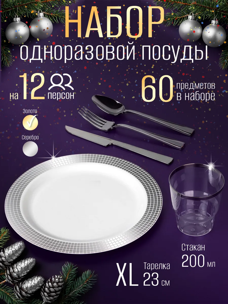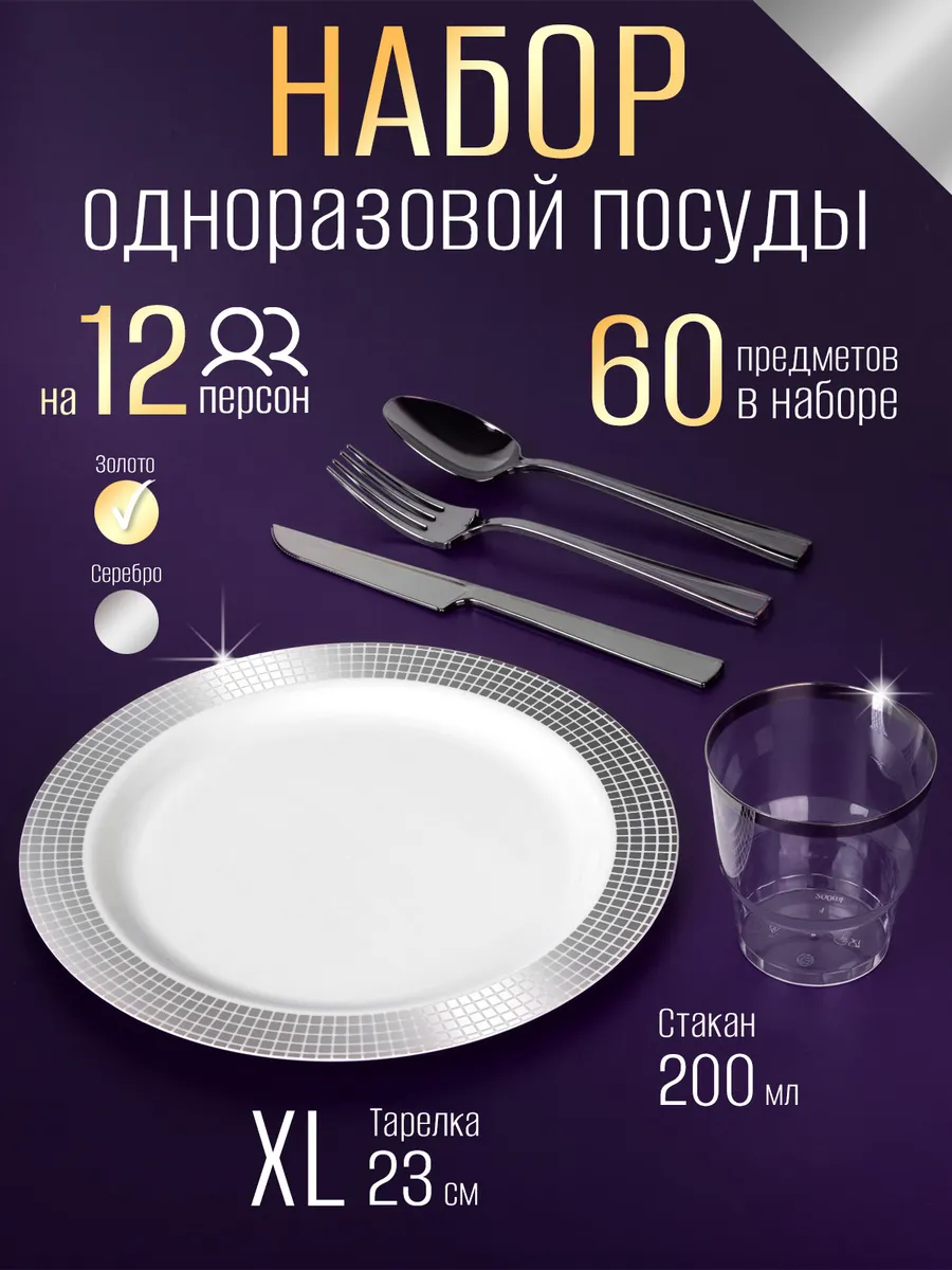 Набор одноразовой посуды для праздника на 12 персон станет вашим незаменимым помощником в организации свадьбы или пикника. В комплекте 60 предметов, включая одноразовые тарелки, пластиковые стаканы, вилки, столовые ложки и ножи. Белые тарелки с серебристой каймой добавят изысканности вашему празднику, а серебристые приборы подчеркнут элегантность сервировки. Прочные разовые стаканы объемом 200 мл подойдут как для детских напитков, так и для взрослых коктейлей. Подходит для дня рождения, юбилея, свадебная или корпоративного мероприятия. Посуда одноразовая для праздника станет отличным выбором для пикников и отдыха на природе , гендер пати . Используйте его для подачи горячих и холодных блюд, закусок и десертов. Пластиковая посуда не подходит для использования в микроволновой печи, но его легкость и прочность делают его незаменимым для быстрого и удобного сервирования. Праздничные наборы одноразовой посуды также отлично подойдут для кейтеринга, фуршетов и банкетов. Они обеспечат стильную и практичную сервировку, где бы вы ни находились. Одноразовая посуда пластиковая отличная в организации любого праздника, будь то день рождения, корпоратив или пикник на свежем воздухе. Набор посуды также подходит для доставки готовых блюд из кафе быстрого питания, что делает его универсальным решением для любого случая. Он не только облегчает процесс сервировки, но и добавляет нотку изысканности в любое мероприятие. Независимо от того, планируете ли вы большой праздник или небольшую встречу, этот набор станет идеальным выбором для создания праздничной атмосферы. Одноразовая пластмассовая посуда для праздника – это не только удобство, но и стильное решение для вашего мероприятия. С набор одноразовой посуды для праздника вы сможете легко организовать сервировку, которая порадует ваших гостей и создаст атмосферу настоящего праздника.