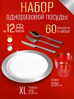 ✨ Идеальный выбор для свадьбы, дня рождения или пикника – набор одноразовой посуды на 12 персон в белом цвете с серебристой каймой!